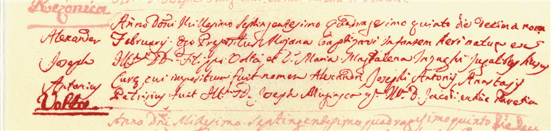 Atto di nascita di Alessandro Volta conservato nella parrocchia di S. Donnino a Como