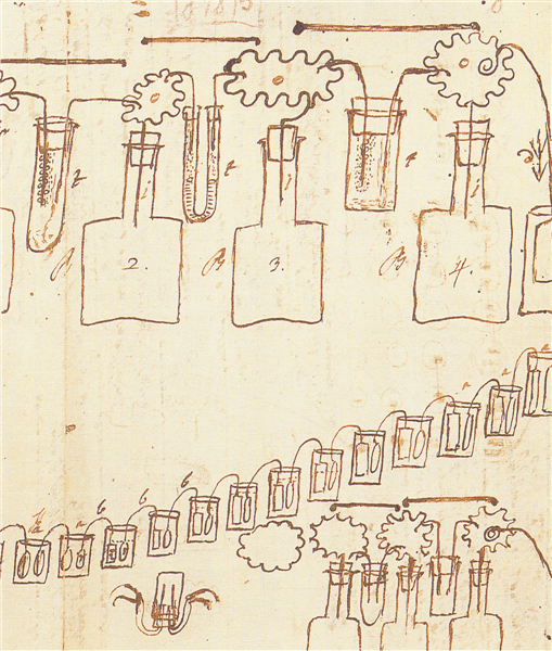 Nella lettera del 20 marzo 1800 a Sir Joseph Banks, Volta descrive, accanto alla pila a colonna, un’altra configurazione del suo organo elettrico artificiale: la pila a corona di tazze. Questa versione rende più evidente il ruolo dei liquidi e dei metalli nel generare elettricità continua.